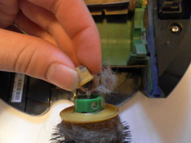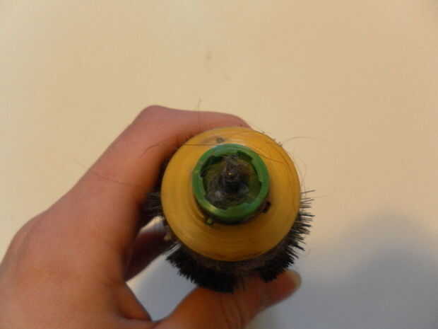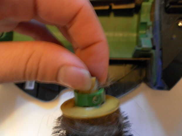 Primero invierta su Roomba y empuje hacia abajo y sostenga en ambos de las dos pestañas de plástico amarillo en la parte inferior de la unidad de cepillo y levante para que puedas acceder a las escobillas. Ahora que tienes acceso a las escobillas que puede retirar los cepillos de Roomba y eliminar cualquier pelo, suciedad, cadena, según Puede utilizar unas tijeras pequeñas para cortar cuidadosamente en el pelo u otras cosas pegados alrededor de los cepillos, solo ser cuidado de no dañar las escobillas al hacerlo. Ahora quite la tapa de plástico amarillo, ubicada en un extremo de las escobillas. Una vez que haya quitado el tapón situado en un lugar seguro y utilizar una foto del diente para quitar cualquier cosa metida en la hendidura donde la tapa solía ser. Después de que vuelva a colocar la tapa de la escobilla sólo debe encajar en y vuelva a colocar el cepillo en Roomba. Finalmente, repita los pasos ya mencionados en la otra escobilla y re cierre la cubierta del cepillo.