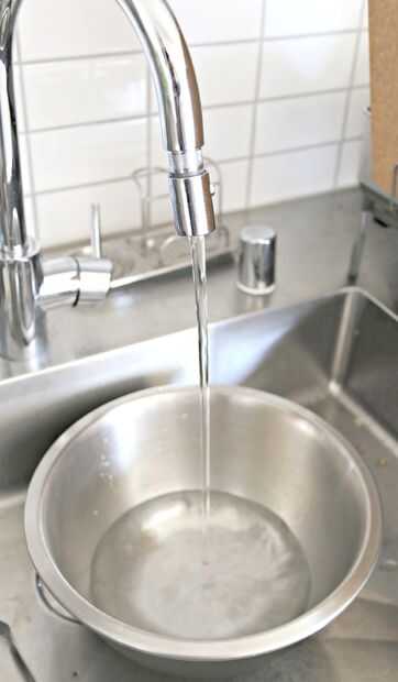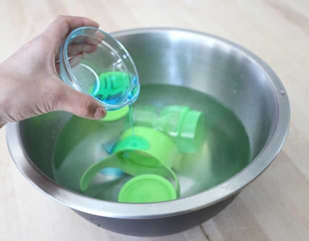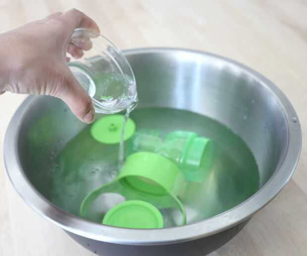 Llenar un bol con agua tibia a caliente y agregue 2 cucharadas de blanco vinagre y 1 tbls plato jabón.