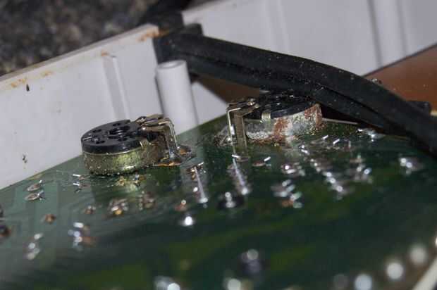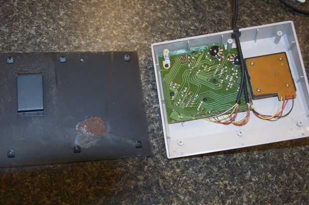 El interior de la mina se ve bastante mal. Hay un punto grande de moho en la base y hay mugre o algo por todo el interior. Puede ver la suciedad y óxido en los potenciómetros.