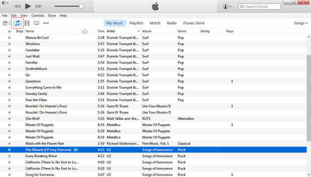 Iniciar iTunes en su computadora y haga clic en el icono de la música en la esquina superior izquierda. Los archivos de música aparecerá en la ventana de abajo.