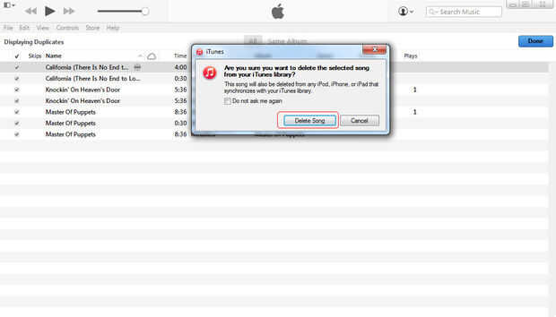 iTunes mostrará un cuadro de diálogo emergente y preguntarle donde desea colocar los elementos eliminados. Elija mover a la papelera de reciclaje en el cuadro de diálogo y la canción duplicada se eliminarán permanentemente. La gente puede borrar las canciones duplicadas en iTunes una por una con este método. Si tienen toneladas de canciones duplicadas, puede utilizar programa de limpieza de iTunes para terminar la tarea.
