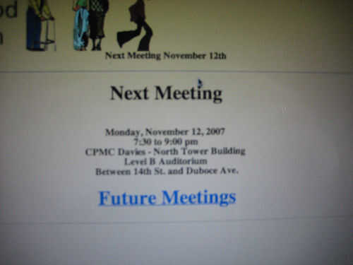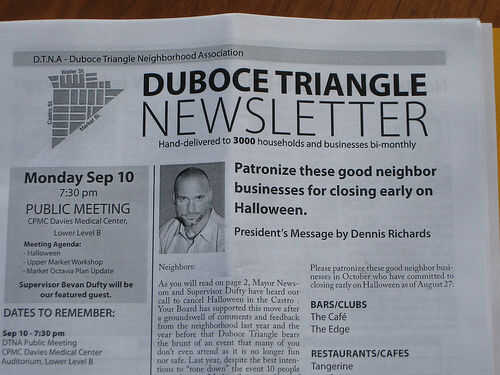 Encontré la fecha de la próxima reunión de mi asociación de vecinos mirando la portada del boletín que encontré en mi puerta. Podría haber también busqué en línea en el sitio de Web de Asociación de vecinos del triángulo de Duboce la próxima fecha de reunión.