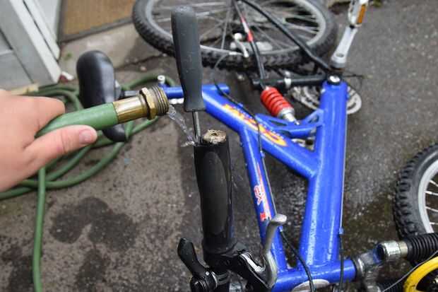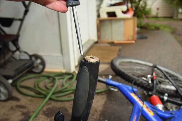 Después de hacer esto, empuje suavemente el destornillador hacia un lado, dejando un pequeño espacio entre el manillar y el puño. Después, vierta agua en el vacío y retire el destornillador. Originalmente usé wd40 (un aceite penetrante) pero más tarde descubrió que agua simple funciona tan bien y no necesita para nada limpiar después de él.