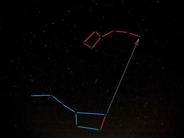 Por suerte, no sólo es Polaris con dos estrellas de la Osa, es en realidad una parte del carro pequeño, es fácil comprobar si usted está buscando en la estrella de la derecha. Como la Osa, el pequeño cazo (OSA menor) se compone de siete estrellas, tres en el mango y cuatro en la cabeza de la cuchara (marcada en rojo). Carro menor flota por encima de su hermano mayor y tiene un ángulo como si estaba vertiendo agua en la cuchara más grande. Polaris es la última estrella en el mango del carro menor.