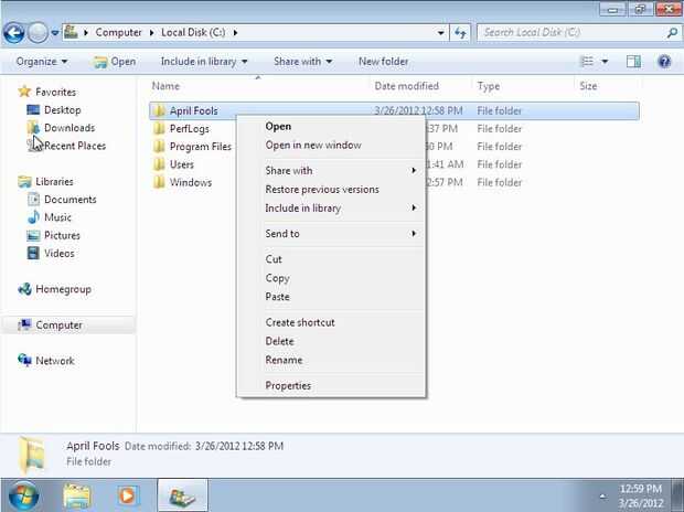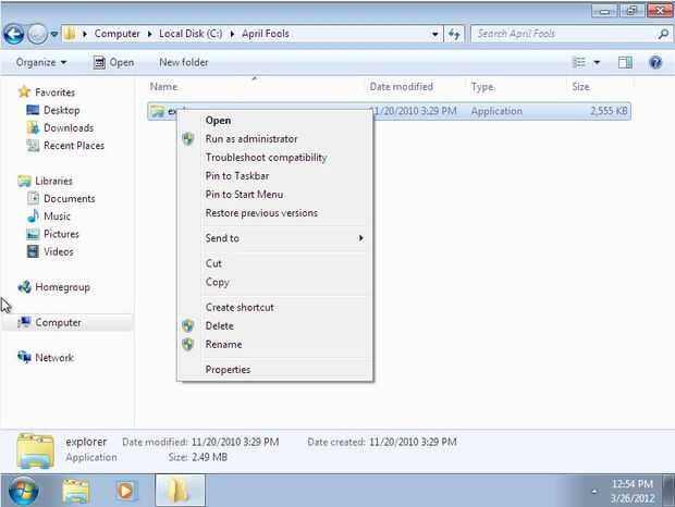 Haga clic en "Inicio" y haga clic en "Equipo" o "Mi PC" (dependiendo de su sistema operativo... sólo uno aparece.) Haga doble clic en la unidad "C:". Haga doble clic en la carpeta "April Fools", luego haga clic derecho en el archivo "explorer.exe". En Windows 7 sólo puede mover el archivo, pero no estoy seguro acerca de las versiones anteriores, así que trate de hacer clic en "Corte" en primer lugar, pero si te da algún problema cuando se intenta pegar, volver atrás y utilizar "copia".