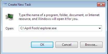 Para usar el taskmgr, presionar "Control" + "Alt" + "Eliminar" junto y si se le solicita, haga clic en "Iniciar administrador de tareas". Haga clic en "Archivo" y luego "Nueva tarea (ejecutar...)". En esa ventana, escriba la ruta del proceso (si has usado la carpeta de "April Fools", será C:\April Fools\explorer.exe).