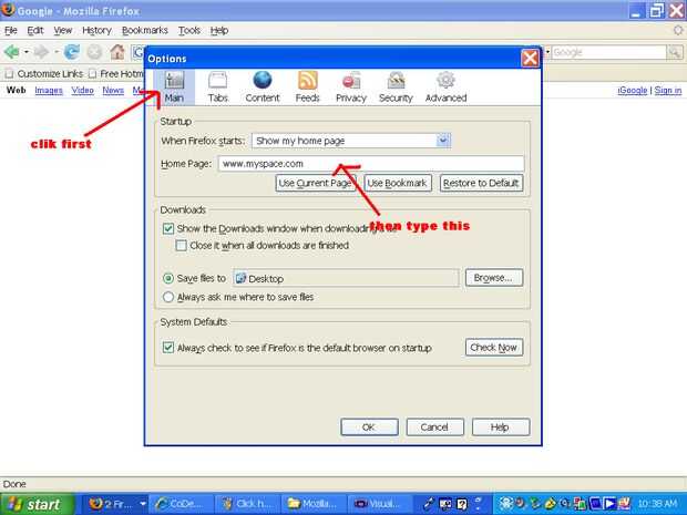 Primero ir a herramientas luego opciones luego haga clic en la ficha principal entonces tu página de inicio a www.myspace.com ahora Pulse ok para salir de los menús de juego. Ahora pulse el icono de inicio en la herramienta