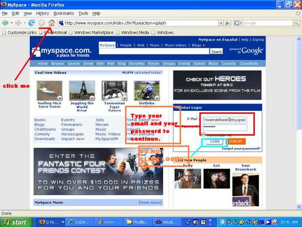 bar para ir a myspace. ¡ YAY! Estamos en myspace. pero codeen no le deja pasar. pero no temo que nunca