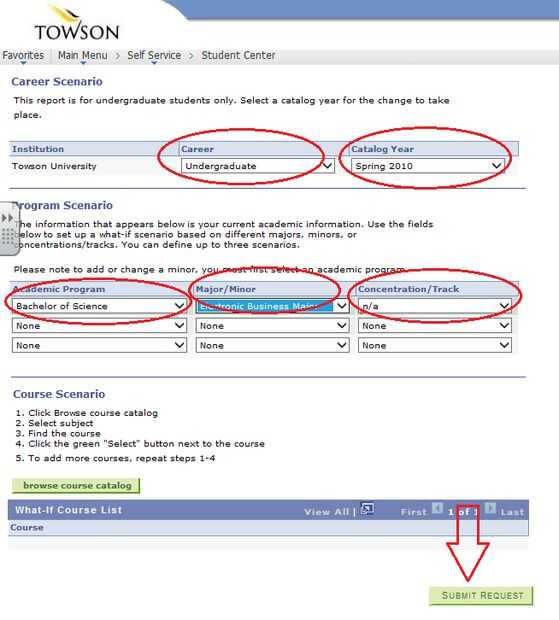 Por ejemplo: si quería cambiar a electrónica grandes empresas, seleccionar Licenciatura de mi carrera, primavera 2010 para mi año de catálogo, soltero de la ciencia para el programa académico, negocios electrónicos para mayor. Relleno en el menú desplegable basado en lo que se aplica a su comandante.