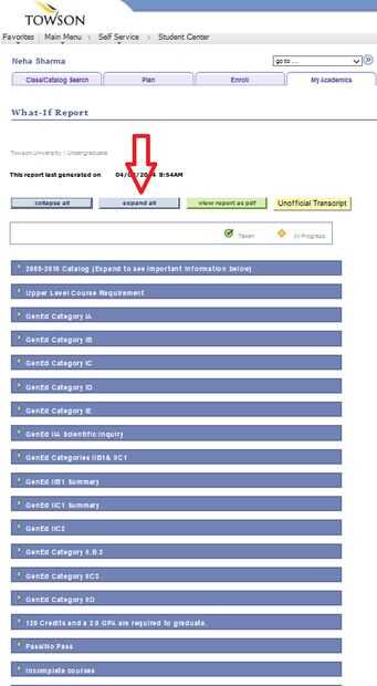 Esto traerá su informe What If. Haga clic en el botón Expandir todo para ver qué curso usted ya ha tomado y lo que necesita que lo lleve hacia los principales cursos están cambiar a.