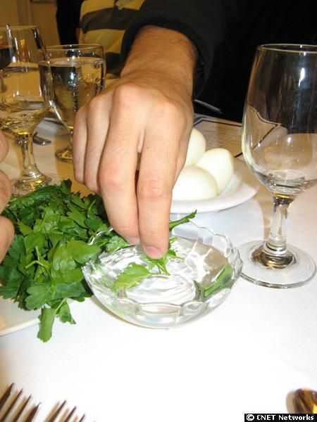 Un vegetal verde, más a menudo perejil, se sumerge en agua salada (que simbolizan las lágrimas de los esclavos judíos) y se come.