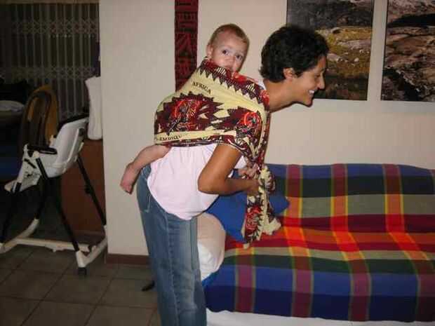 La parte superior de la tela se sube a los hombros del bebé (los bebés mayores pueden dejar los hombros al descubierto, los más pequeños bebés más necesitan de apoyo).