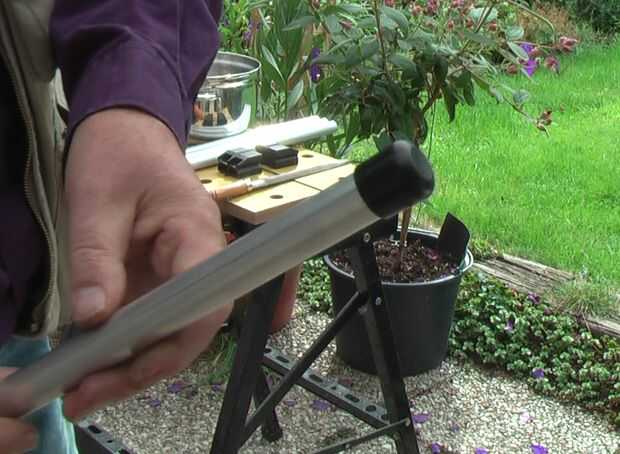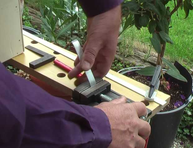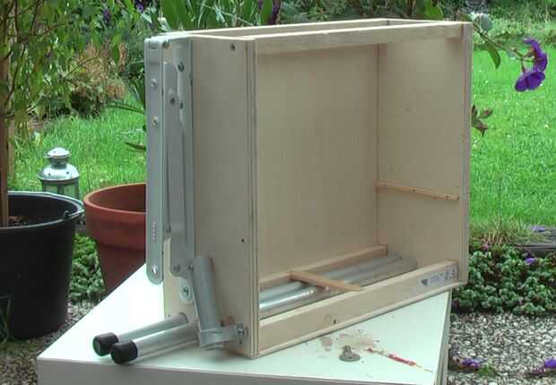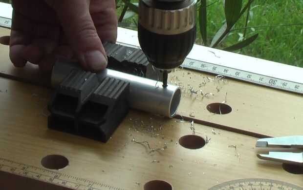 Para las piernas tenemos que cortar el dos aluminio tubo de 100cm - 40 pulgadas en el centro. Por un lado un tope pata de plástico debe ser pulsado en el tubo. Es va mejor al poner la tapa en agua caliente primero. Después de el titular de la pierna debe ser hecha. El agujero de conexión en el medio tiene que ser 1 0,4 pulgadas desde la parte superior. El grillete redondo de tira de aluminio, lo que mantiene el legholder en su lugar se hace con las piezas de elevación en la mente. Para realizar la mesa de trabajo estable en el suelo las piernas tienen que dirigir hacia el exterior. Hasta qué punto eso es depende del elevación bloque directo debajo de la tubería. La posición del tornillo en la parte superior del legholder es 6,3 2,5 pulgadas de la parte delantera o trasera y 9,3 3,6 pulgadas desde la parte inferior. La última foto muestra las piernas almacenadas en la parte inferior del cajón. También el soporte de estante plegable 30 cm - 12 pulgadas acoplado a la caja de herramientas en 5cm - 2 pulgadas de la parte posterior. Por último, se monta la tira de aluminio espaciado. La longitud es de 22cm - 8.6 pulgadas.