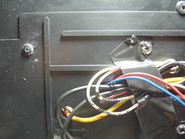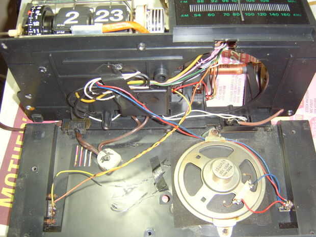 Levante la base y observe dos tornillos debajo del reloj – quitar ambos y quitar la cinta aislante que sujeta el conjunto de cable en su lugar.