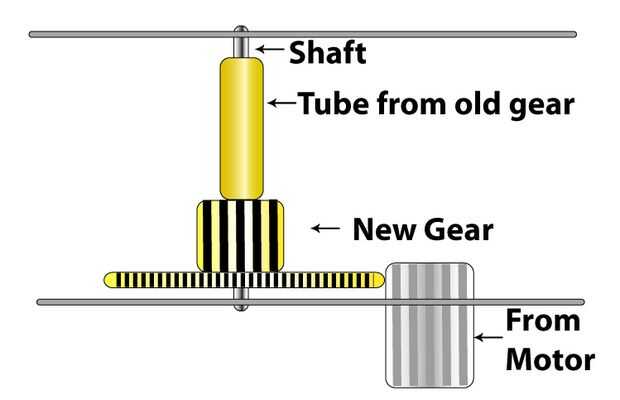La solución fue cortar el viejo engranaje. Corte el tubo del eje en el equipo antiguo y luego coloque la pieza cortada sobre el nuevo engranaje en el eje, empujan el engranaje de nuevo hacia el engranaje del metal del motor (ver esquema).