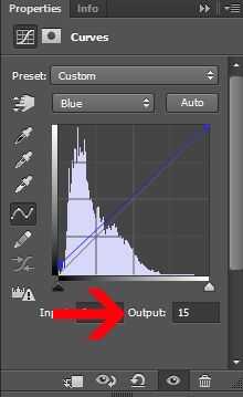 2. ir a RGB en el cuadro de diálogo curvas y elegir azul y ajustar la salida un poco, arrastre la línea hacia arriba desde la esquina inferior izquierda (como se puede ver en la 2ª imagen de arriba), utiliza una salida de 15.