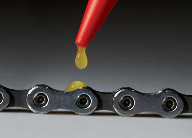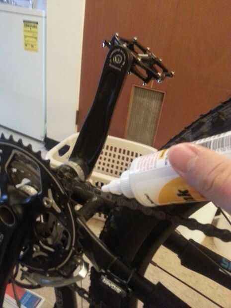 Aquí viene el paso principal de esta instrucción, lubricar la cadena. Al hacer esto, mantenga el frasco de lubricante y puso la cabeza de la botella de lubricante de la cadena y apretar suavemente la botella para dejar lubricante sale muy lentamente para evitar que gotee lubricante extra en el piso.