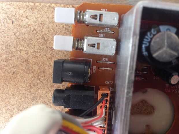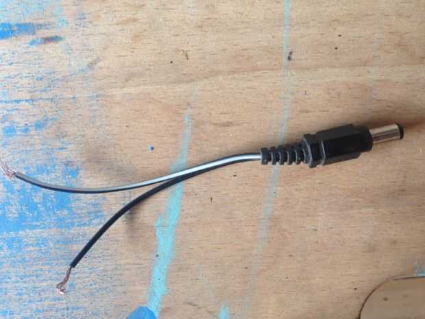 Cortar el cordón de alimentación de 6-7" del final. Dividirlo en 2 hilos. Enchúfelo en el puerto DC IN de la placa.