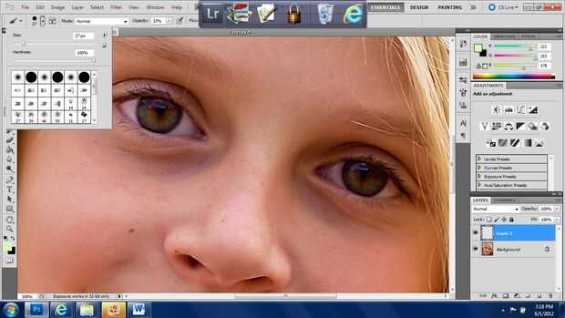 Asegúrese de que está seleccionada la capa en blanco y presione la letra "B" en el teclado. Esto trae para arriba la herramienta pincel. En la configuración del pincel, cambiar el tamaño de píxel, por lo que es el tamaño de la zona coloreada del ojo y todo el camino a subir la dureza. También asegúrese de que su opacidad es al 100%.