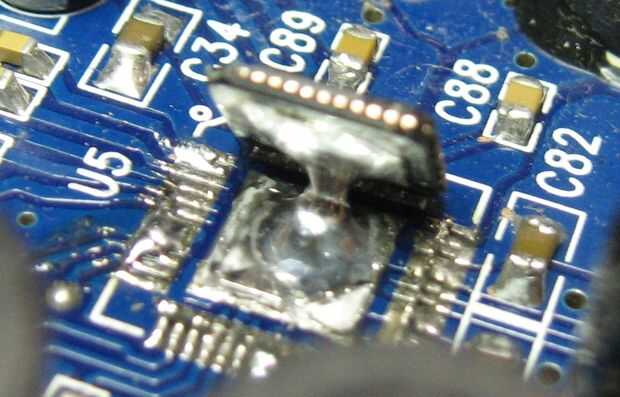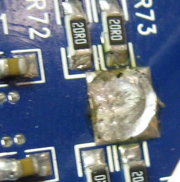 Entonces Giré mi soldador hasta una temperatura más alta de lo normal y había sostenido a la almohadilla/vias en el otro lado de la Junta hasta que el estaño fundido a través de todo el camino. El chip vino suelto y separado de la PCB, y luego pude conseguir debajo de él para liberar el resto del camino.