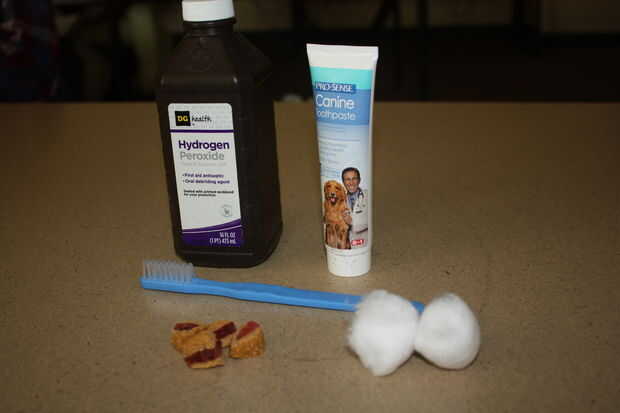 • cepillo de dientes • pasta de dientes (recomendamos pollo condimentado sobre menta) • perro trata • bolas de algodón • el peróxido de hidrógeno • un ayudante puede ser necesario