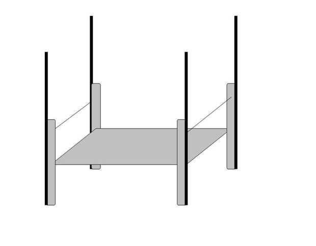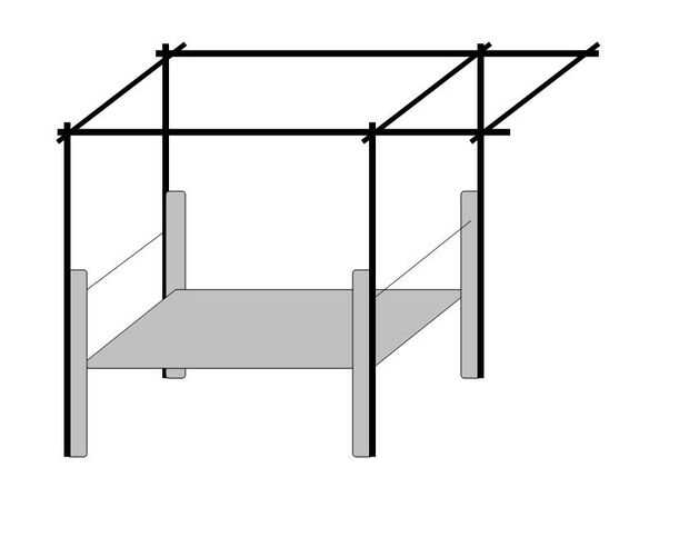 Atar los postes de 5 pies a las patas de la cama - zipties sería lo ideal. Estos serán los cuatro postes en las esquinas de la cama.