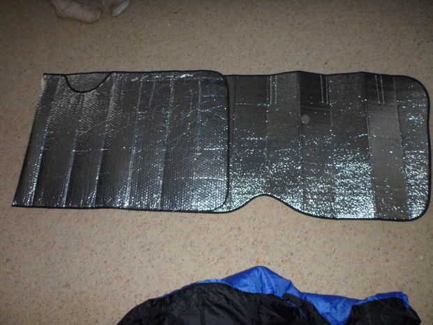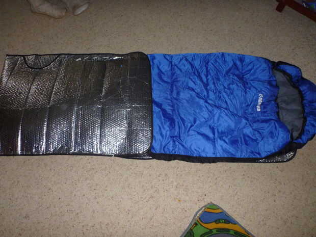 Hola, este es una gran idea para mantener el calor mientras está acampando. es bastante auto explicativo, todo lo que tienes que hacer es coser dos reflectores de calor de parabrisas de coche juntos y poner de su bolsa de dormir dentro. refleja la mayor parte de su calor del cuerpo en usted para que mantener mucho más cálido. Este costo en 10 dólares, como uno de los costos de reflectores $7, el otro ya tenía y la cadena tuvo así. Espero que esto era útil y lo mantiene caliente.