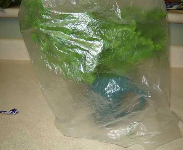 Lugar hierbas en un recipiente, poner el plástico bolsa encima de las hierbas y poner todo en el refrigerador. La bolsa debe quedar abierta en la parte inferior para dejar entrar aire.