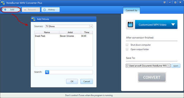 Nota: Puede que necesite descargar los alquileres de iTunes en su computadora antes de importarlos en el programa. NoteBurner M4V Converter Plus requiere el iTunes lanzado y reproducir la película en modo de pausa con una pantalla en negro. Así que por favor no controlar iTunes Noteburner está trabajando.