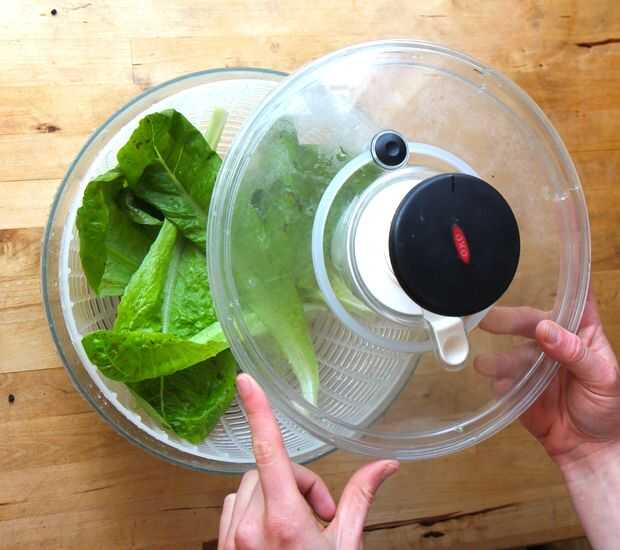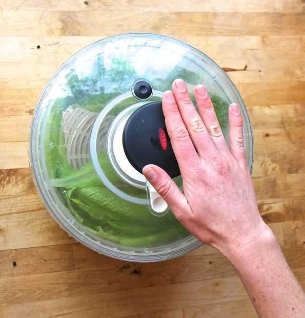 Volver a colocar sus verdes en su ensalada spinner en un lote pequeño. Quieres trabajar en lotes para este paso para asegurarse de que no agrupan sus verdes y para que seque correctamente. Coloque la tapa sobre el cono y girar las verduras hasta que estén secas. También puede borrarlos secas con una toalla de plato.