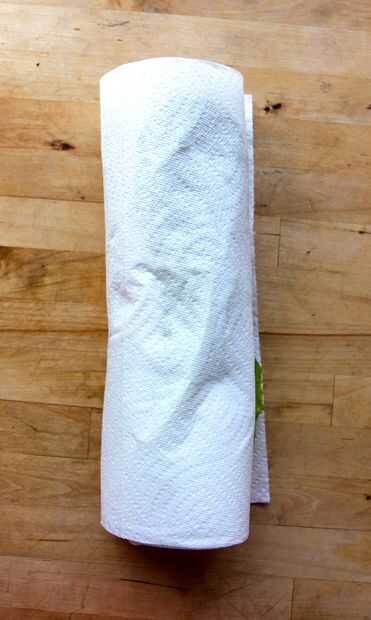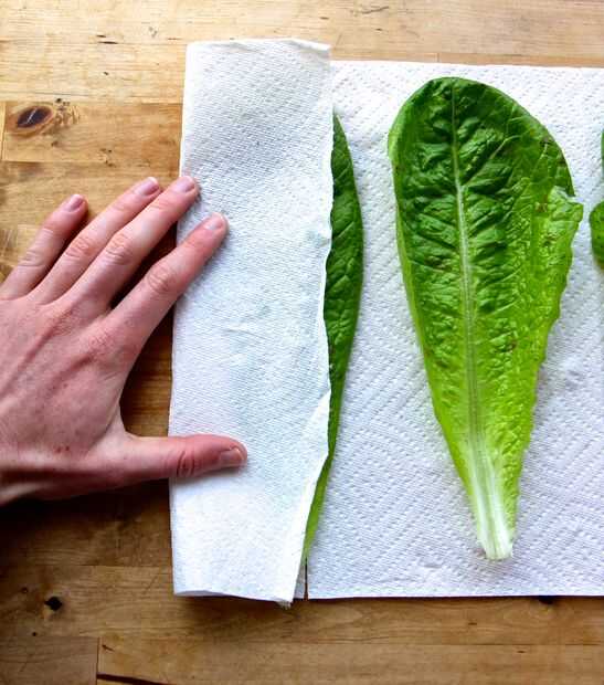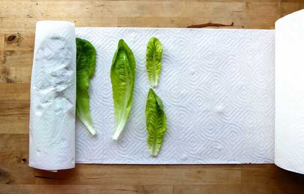 Doble el extremo con el espacio de la primera hoja. Comenzar a rodar, envolver la lechuga deja la toalla de papel a medida que avanza. Romper las toallas de papel del rodillo cuando la lechuga está envuelto. Las toallas de papel se absorber cualquier humedad adicional y mantener la humedad más alta.