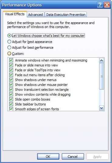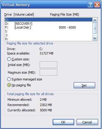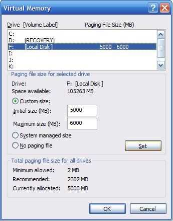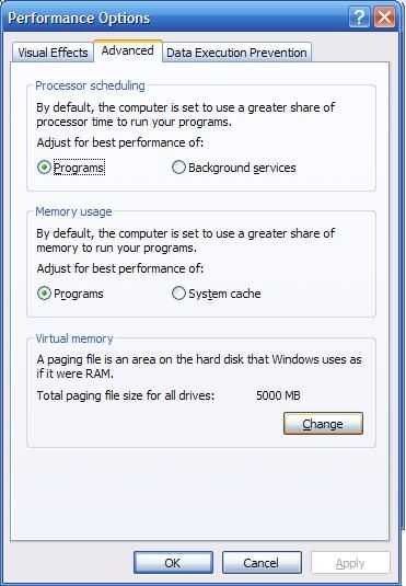 Ahora lo quiero hacer es abrir "Mi PC". Haga clic en el enlace "Ver información del sistema" en la parte superior izquierda de la pantalla. Una vez abierto haz clic en el la pestaña "Avanzado". La voluntad de ser un cuadro que dice haga clic en "Rendimiento" en el botón que dice "Configuración". En la primera pestaña es llamada "Efectos visuales", puede editar bien tu computadora funciona o mira. Usted puede elegir la configuración automática de "Aspecto" o "Rendimiento", o puede haga clic en personalizado y elegir lo que te gusta. Menos seleccionado, cuanto más rápido el equipo llevará a cabo. Haga clic en aplicar. Después de esto Abra la pestaña "Avanzado". Tanto los cuadros de "Programación de procesador" y "Uso de la memoria" deben establecer programas. El cuadro final que dice "Memoria Virtual" debe decir cuántos megabytes el PC utiliza como "Memoria Virtual" o memoria Ram que se asigna en el disco duro. Haga clic en "Cambiar". Este paso sólo es útil si tienes un disco duro extra además de la con sus archivos en él (Windows OS), o si tienes un pendrive que puede cometer para acelerar tu computadora o disco duro externo. Si usted cumple con uno de estos requisitos, primero seleccione su disco duro principal con el sistema operativo en ella y seleccione el "archivo de paginación de No" y haga clic en establecer. Después de usted seleccione unidad de disco duro extra o unidad flash en el menú de arriba y seleccione "Tamaño personalizado". En el tipo de cajas de texto en un número relativamente alto basado en cuánto espacio tienes en el disco extra. Mi puse a un tamaño mínimo de 5000 MB y y el tamaño máximo de 6000 MB. Se trata de un buen número alta que permite su ordenador para nunca quedarse sin memoria virtual. Después de configurar el tamaño, haga clic en "Set". Luego haga clic en "Aceptar" y cerrar estas ventanas.