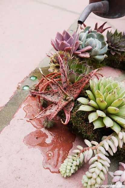 2.-riego. Dependiendo de las temperaturas y la exposición, un buen riego una vez cada 1-3 semanas va a estar bien. Algunas de las formas son bastante superficiales y no pueden contener un montón de tierra para que tenga al agua su corona más a menudo que lo haría con sus suculentas en macetas. Tomar la corona hacia abajo, lay flat y agua bien. Puede hacerlo con una regadera vertedera estrecha, por la bruma con un atomizador o con un gental flujo de la manguera de jardín. Deje que el agua todo vaciar antes de colgarlo nuevo.