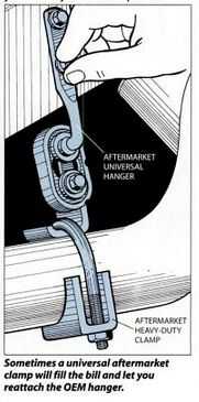 Debe intentar hacer accesorios muy cerca de la ubicación de la configuración original del equipo. Esto mantendrá la alineación del sistema y la caída del equilibrado de todo el sistema. Si hay ruido de contacto del sistema de escape con la parte de abajo o una parte de la parte de abajo, usted debe comprobar daños por debajo. Separaciones de sistema de escape son limitados, y si ves la necesidad de aumentar uno, es posible doblar o acuñe una suspensión de equipo original. Si un gancho de barra tipo es soldado con autógena en el lugar, ver si puede doblar con un pedazo de tubo sobre el extremo abierto de la barra.