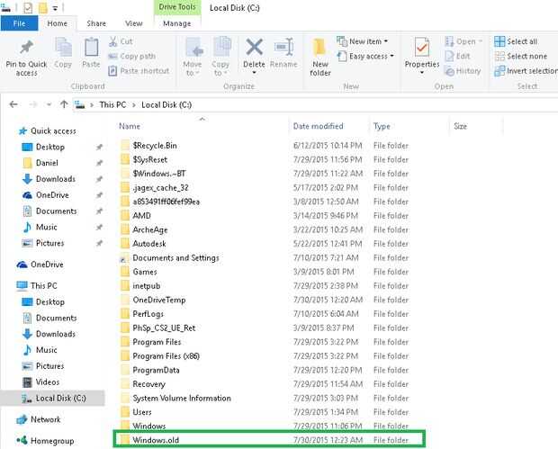 En la unidad C:, debe haber una carpeta llamada "Windows.old". Si no lo veo, que tenga que habilitar los archivos ocultos y desactivar "Ocultar archivos protegidos del sistema operativo" para verlo. Una vez que usted busque este archivo, selecciónelo y pulse CTRL-X o simplemente arrástrelo a su escritorio.