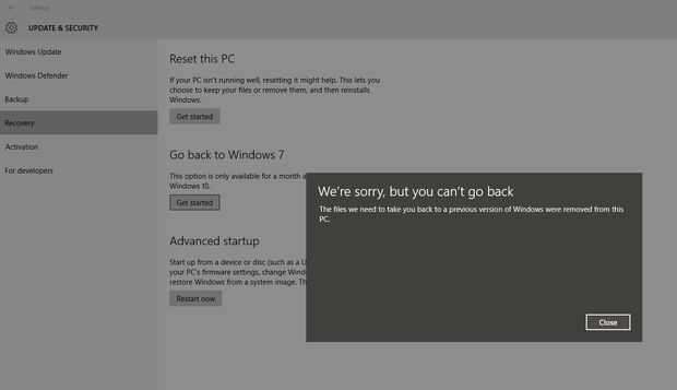 Abrir el menú Inicio y buscar "Reiniciar este PC" y selecciona la primera opción. Llevarán a una ventana que te dará varias opciones. La segunda opción sería volver a la versión anterior de Windows. Para garantizar que este proceso se completó correctamente, haga clic en esto y usted debe traer a un error. Si aparece que Windows no pudo encontrar los archivos viejos, ha guardado con éxito su versión antigua de Windows!