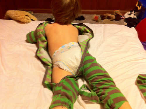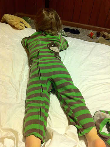 Poner el pijama en tu niño, pero al revés.  Cremallera de la cremallera en la espalda.  Así, él no puede alcanzarla para sacarlas.
