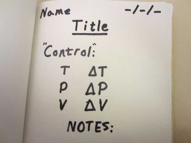 Dependiendo del tipo de experimento que está haciendo, puede variar el formato de la revista. Elegí un formato bastante básico que es fácilmente compatible con experimentos de química. No escriba en su escritura más. En su lugar, utilice un estilo básico, legible. En primer lugar, debe listar el nombre y la fecha actual. En segundo lugar, debe listar el título de su experimento. No debe ser vaga, pero no debe ser largo tampoco. A continuación debe listar resultados de su experimento de control bajo el título, "Control". Lista de información como la temperatura, cambios de temperatura, presión, cambio en la presión, volumen, cambio en volumen, entalpia (si corresponde) y entropía (si esa información es útil). A continuación, tome nota de cualquier cosa pequeña, como si o no la mezcla de burbujas, calentado o enfriado. La información lista es dependiente del tipo de experimento que está llevando a cabo. A continuación debe listar todos la misma información para el siguiente experimento poco, asegurándose de tener en cuenta los cambios que se producen debido a cambios realizados en su entorno... Asegúrese de cambiar sólo un elemento de su experimento entre el control y los experimentos. Repita este proceso para todos los diferentes experimentos poco durante este experimento más grande. Asegúrese de registrar la información.