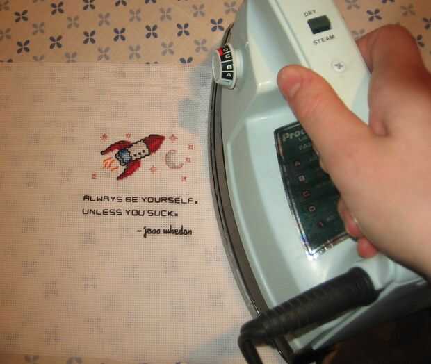 Antes de que el marco de su trabajo, deben ser planchadas para que los pliegues por el aro no preservarse para la posteridad bajo vidrio. Iniciar la plancha en una posición baja y aumentar el calor según sea necesario. No utilice vapor. Sólo hierro la cruz puntada diseño del lado de fuera. Si tu fondo es descosido, hierro alrededor del diseño en la parte final pero tenga cuidado de evitar el diseño acabado.