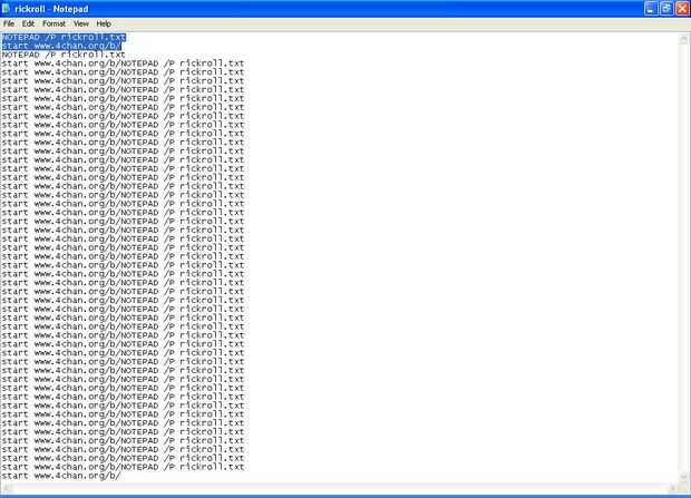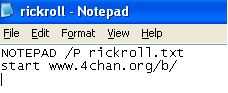 Este código dice Imprimir "rickroll.txt" y para "www.4chan.org/b/" en el navegador de internet.