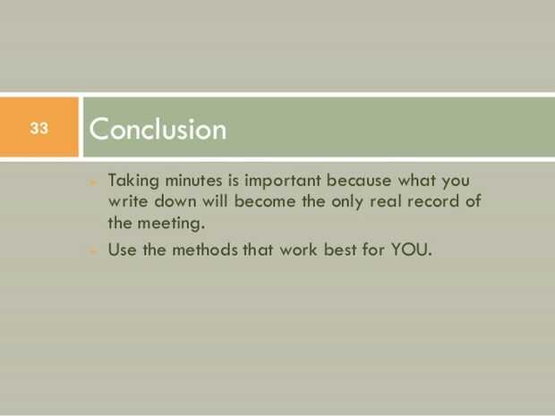 Durante cada encuentro, a pesar de su agenda, hay ciertas conclusiones por todas las personas que asisten a. Antes de mover nunca a otro tema en el programa, asegúrese de que las conclusiones se resumen para que usted discutir ahora y también que cada participante está de acuerdo con las declaraciones.