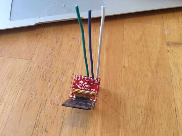 En la parte superior la placa de circuito MicroView son tres cojines de la soldadura ("vias") etiquetado como 11, 12 y 13. Estas son tres de los pines del ISP (In-System Programmer): MOSI y MISO SCK respectivamente. Para programar el cargador de arranque, es necesario enviar señales a estos tres pines; Yo soldado tres piezas cortas de cable de conexión de calibre 22, con la ayuda de mi esposa entrega constante para mantener los cables en su lugar.
