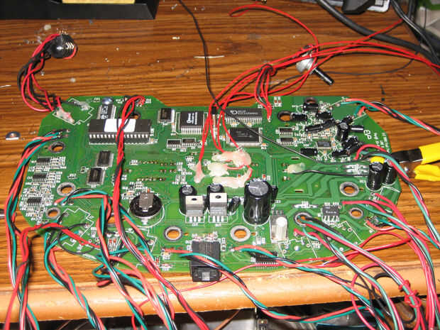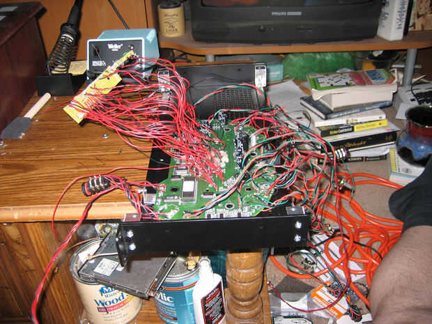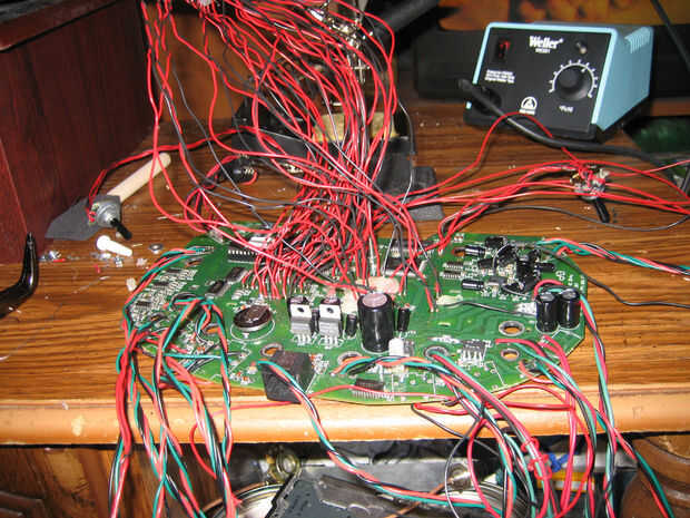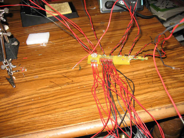 Y luego finalmente, las conexiones de la placa del indicador fue soldado en el PCB... ahora que de empezar a parecerse a un lío de cables... En este punto, montado el PCB en el marco de la parrilla para que sea más fácil trabajar en...
