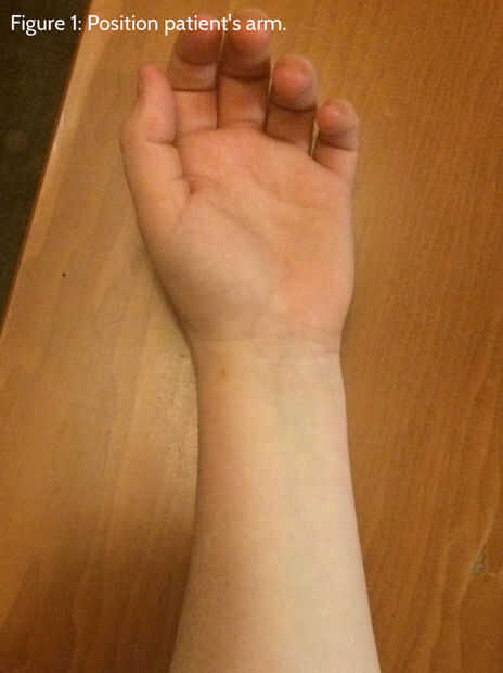 2. Enderece el codo del paciente y cara el interior de su muñeca hacia arriba como se muestra en la figura 1.