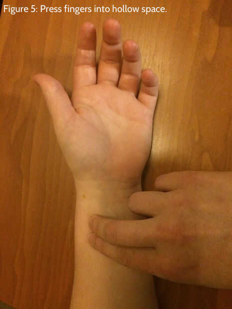 2. Como se muestra en la figura 5, presione sus dedos en el espacio hueco para sentir la arteria radial debajo de la piel.