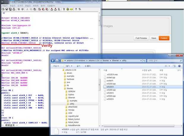 En la carpeta de la utilidad de las bibliotecas de Ethernet , abrir w5100.h y compruebe que sólo la línea #define correcto 1 línea. Para Wiz550io se parece a continuación y como una imagen.