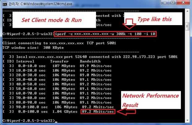 Y el tipo "iperf - c xxx.xxx.xxx.xxx -w 300k -t 100 -i 10" y escriba en la línea de comando como una imagen.