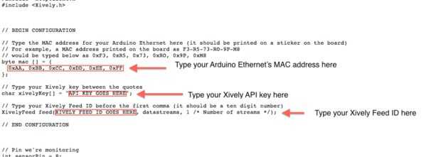 - Xively API key: esto copiamos hacia abajo en el paso ocho. Es una cadena larga, al azar de letras y números. Pasta entre comillas, como en la imagen.