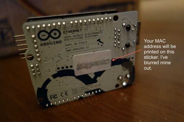 Lo primero que deberás hacer en este paso es mirar en la parte inferior de tu Arduino Ethernet para su MAC address, que debe ser algo así: 5B-8G-C3-EB-38-AM. Anote esta dirección MAC — que usaremos en un poco más.