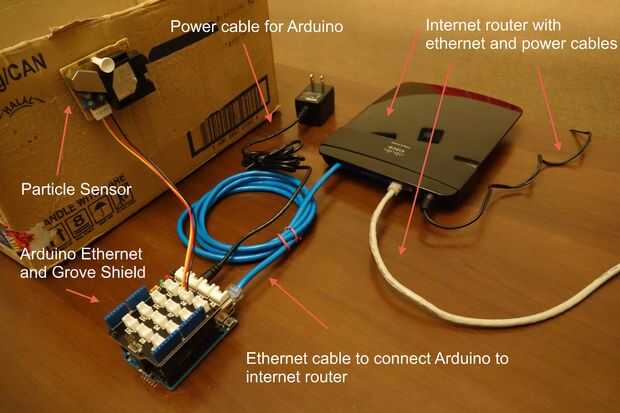Para la mayoría de los pasos anteriores de esta guía que ha tenido Arduino Ethernet conectado al ordenador mediante cable USB. Lo primero que vas a hacer en este paso es desconectar el cable USB para que Arduino Ethernet está conectado sólo al escudo de arboleda, que a su vez sólo está conectado al sensor de la partícula.